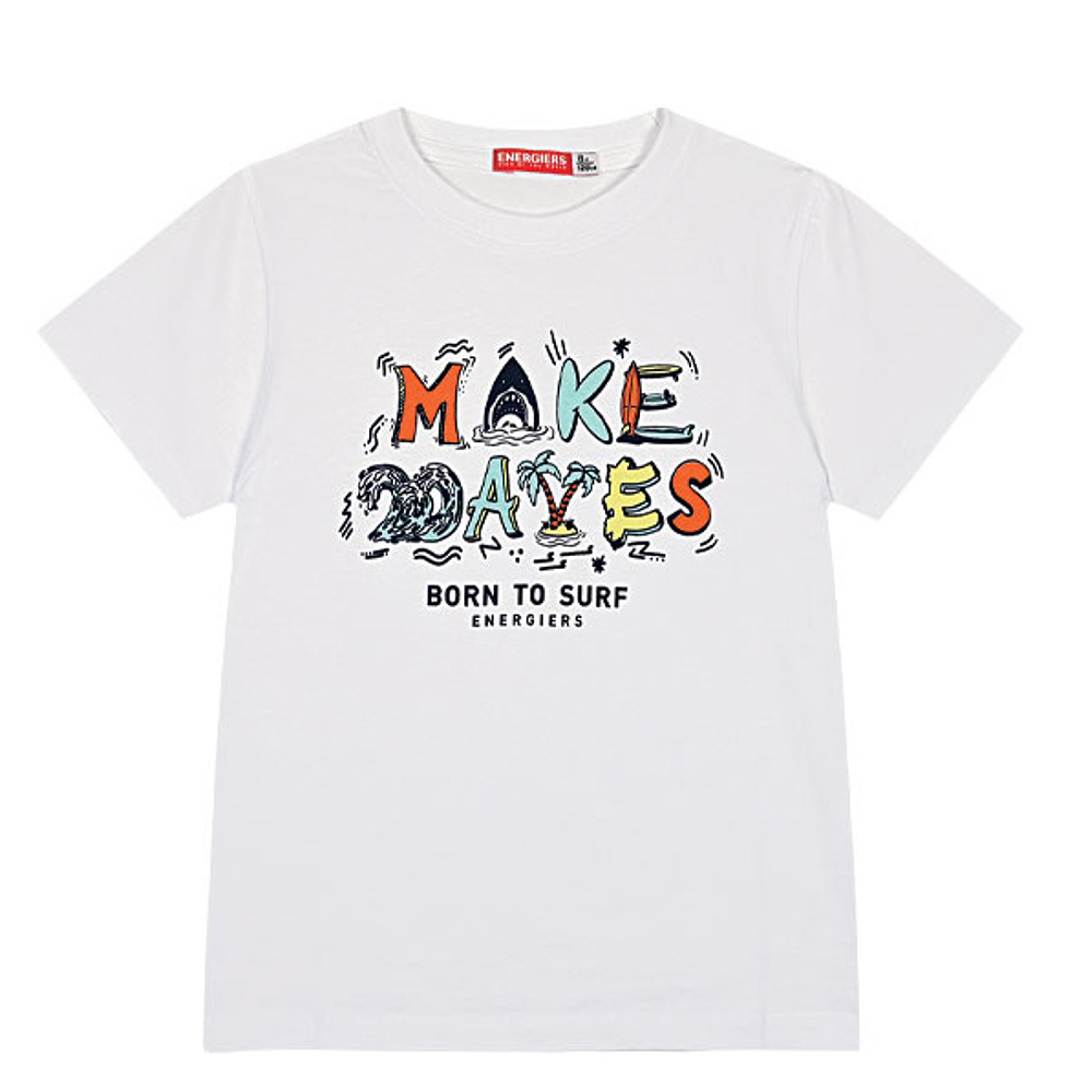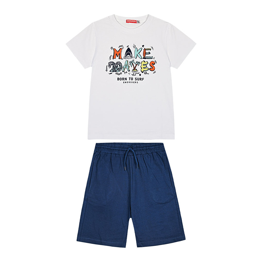 Εφηβικό σετ με τύπωμα Now or Never. Η βερμούδα έχει τσέπες και στο πλάι έχει ύφασμα στο χρώμα της μπλούζας, 100% Βαμβάκι