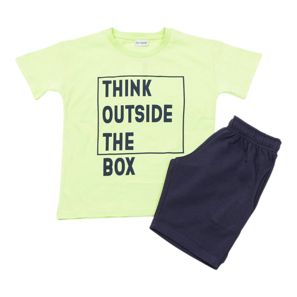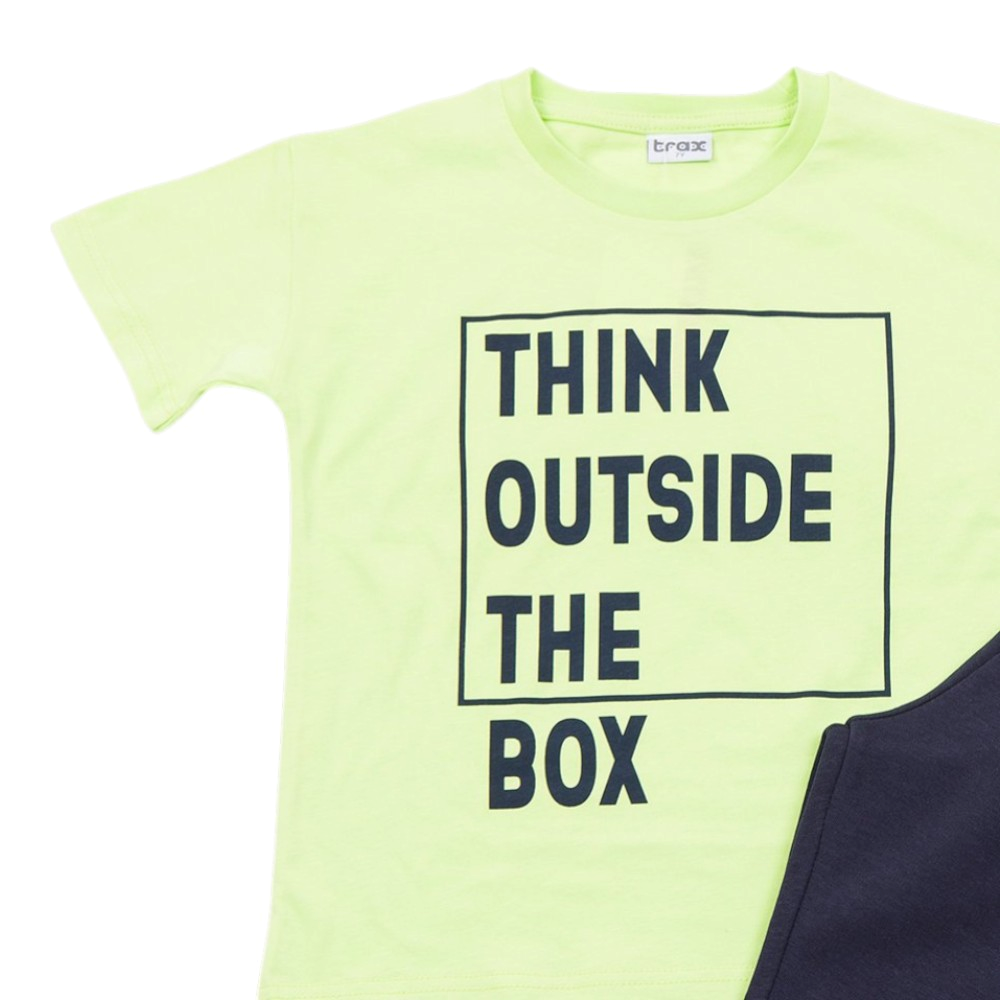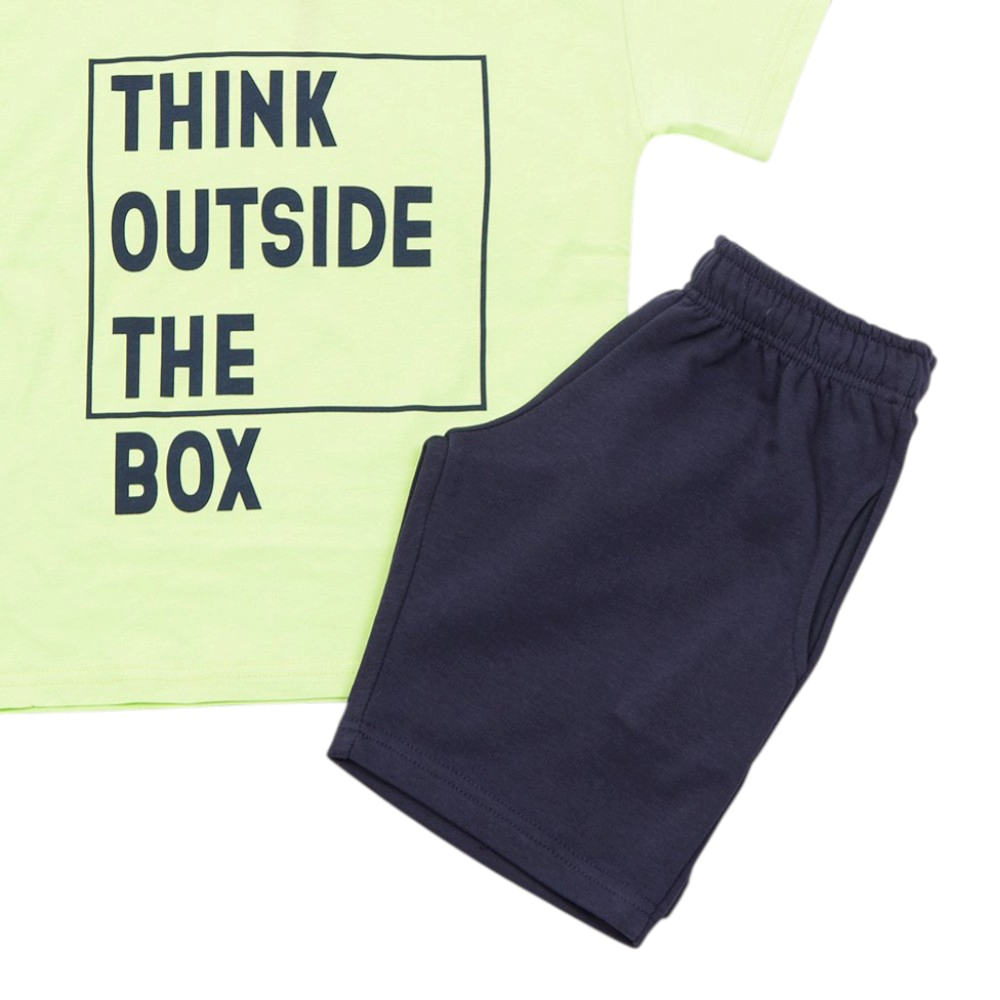 Εφηβικό σετ με τύπωμα Now or Never. Η βερμούδα έχει τσέπες και στο πλάι έχει ύφασμα στο χρώμα της μπλούζας, 100% Βαμβάκι