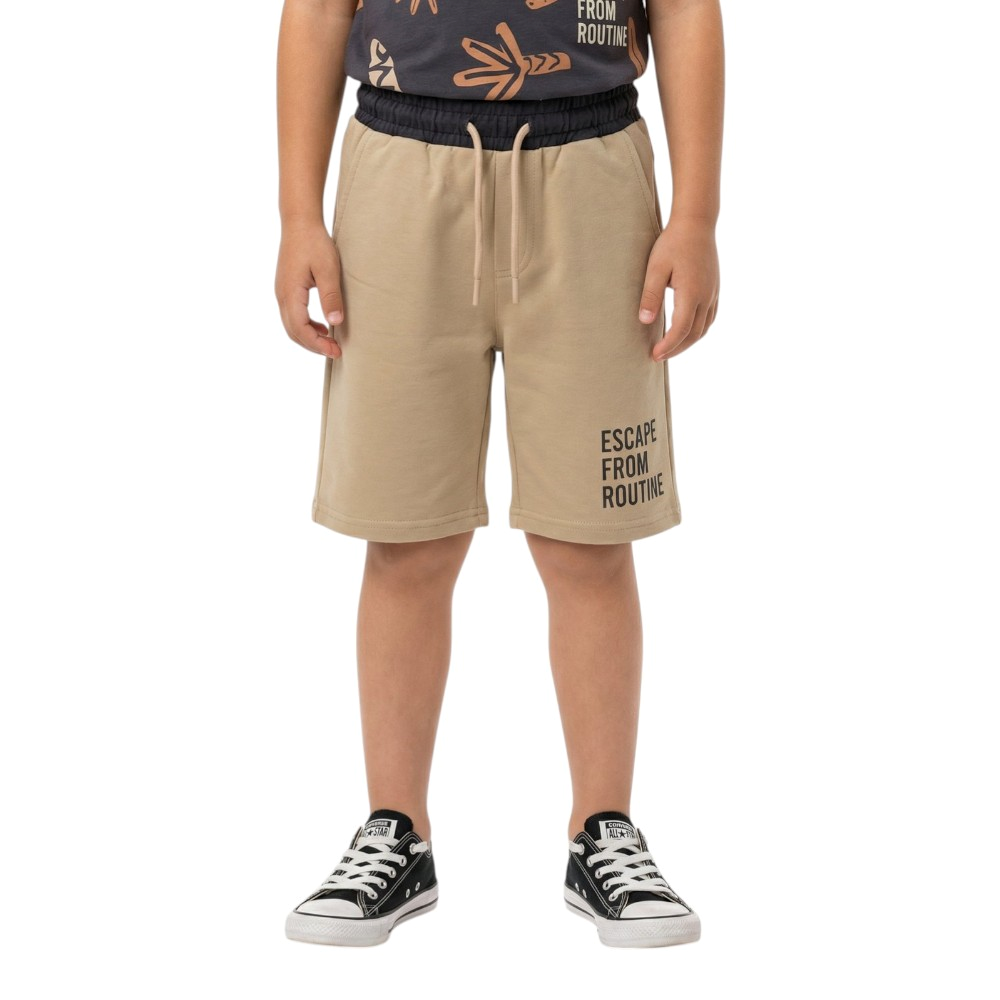 Εφηβικό σετ με τύπωμα Now or Never. Η βερμούδα έχει τσέπες και στο πλάι έχει ύφασμα στο χρώμα της μπλούζας, 100% Βαμβάκι