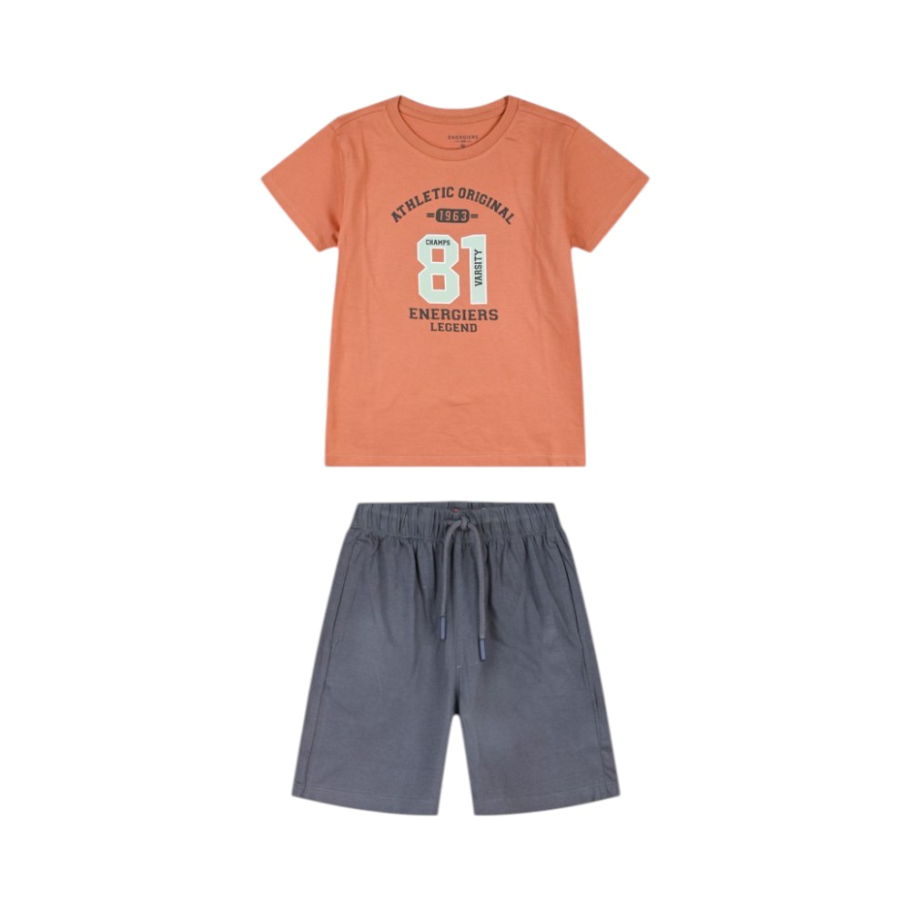 Εφηβικό σετ με τύπωμα Now or Never. Η βερμούδα έχει τσέπες και στο πλάι έχει ύφασμα στο χρώμα της μπλούζας, 100% Βαμβάκι