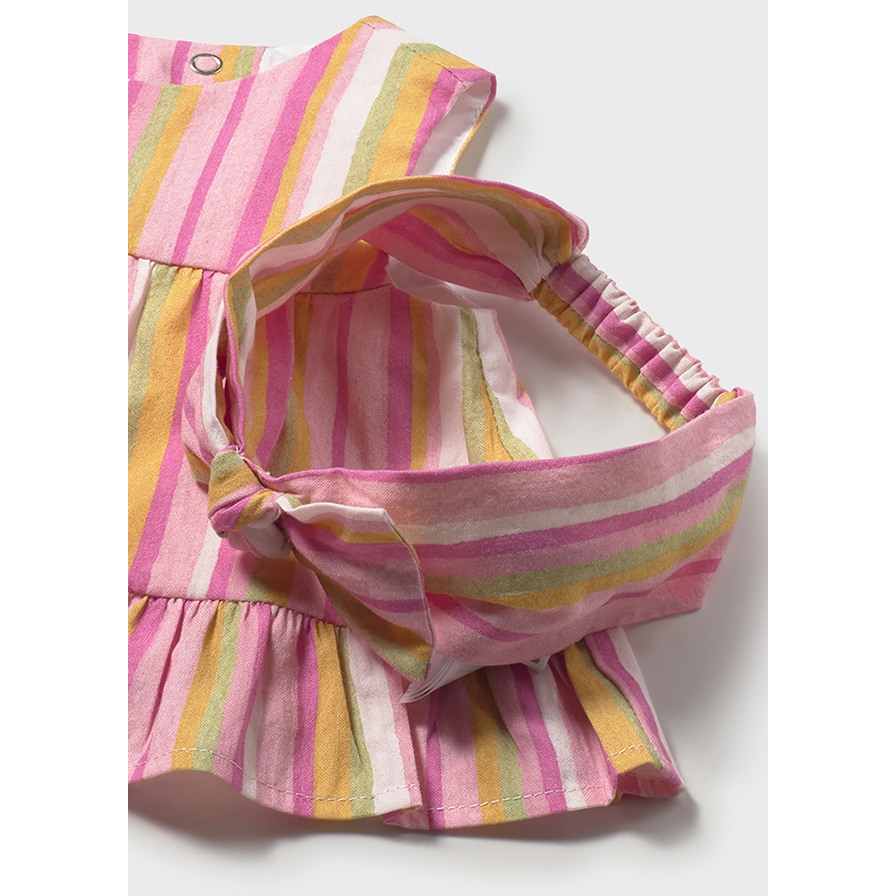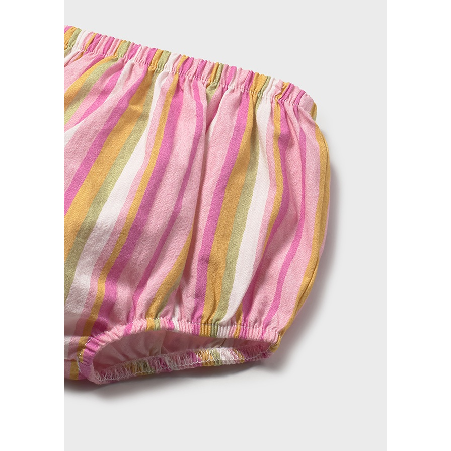 Βρεφικό σετ από σταθερό ύφασμα. Αποτελείται από τοπ με κέντημα στο στήθος, βολάν στα μανίκια και κουμπάκια στο πίσω μέρος. Το σορτς έχει ελαστικό ζωναράκι στη μέση και στο κάτω μέρος καθώς και βολάν, 100% Βαμβάκι, 65% Πολυέστερ, 35% Βαμβάκι