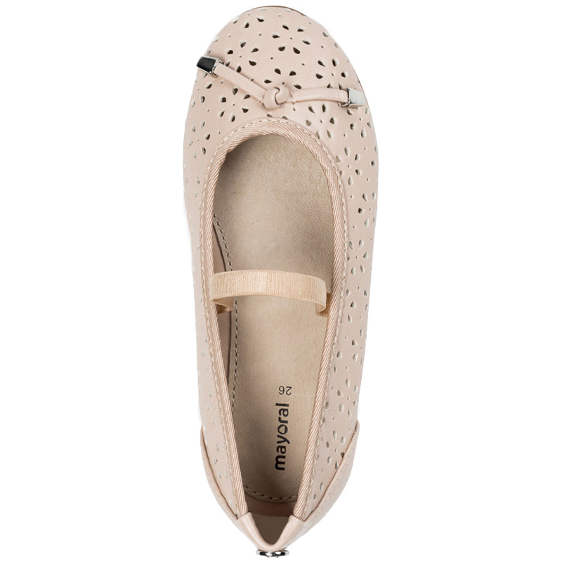 Παιδική μπαλαρίνα με περλίτσες του ισπανικού οίκου Mayoral. Κατασκευασμένη από συνθετικό δέρμα εξωτερικά και δέρμα εσωτερικά. Διαθέτει δερμάτινο πάτο και ελαστική αντιολισθητική σόλα.