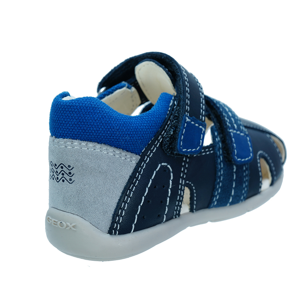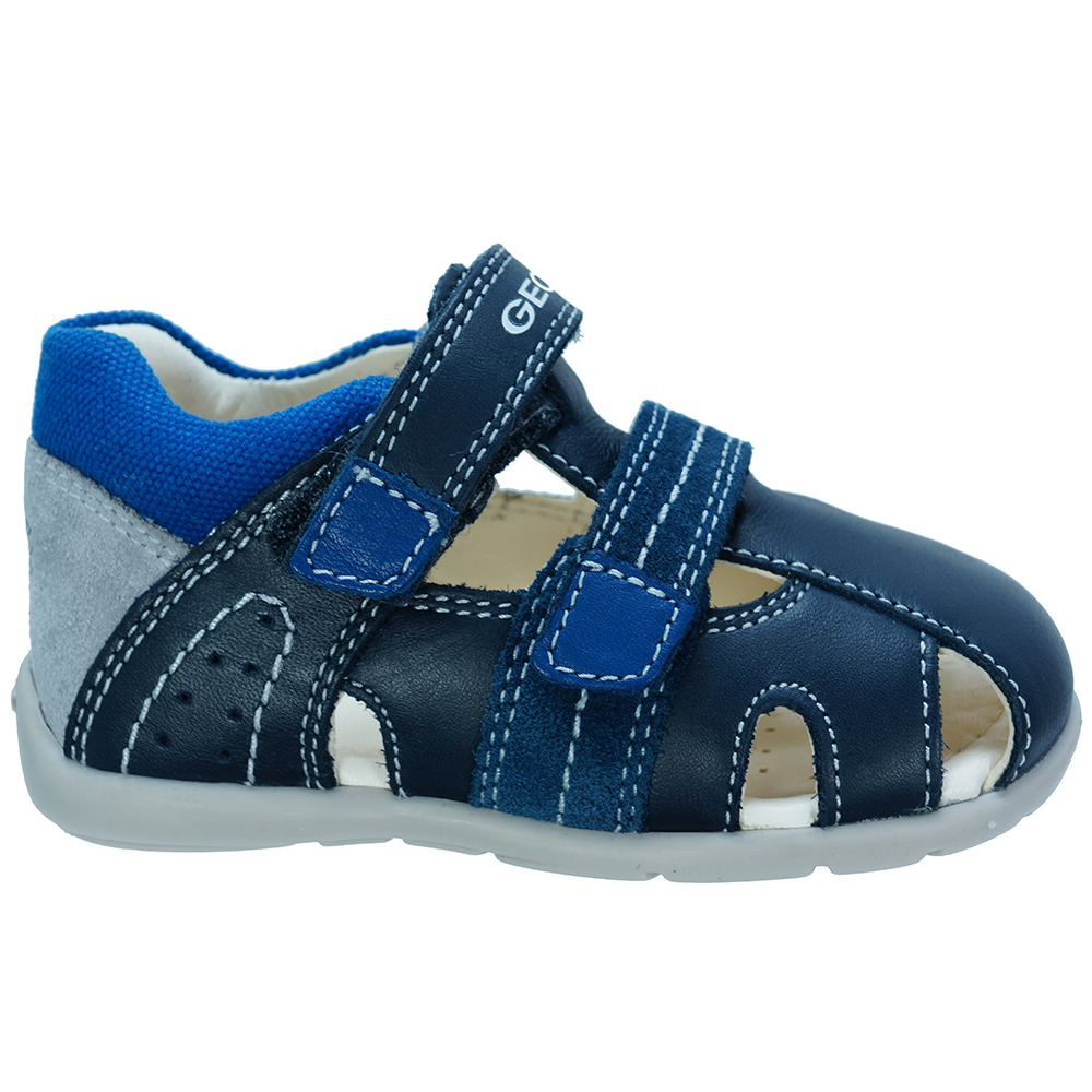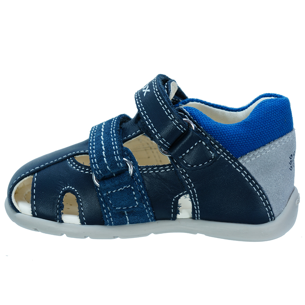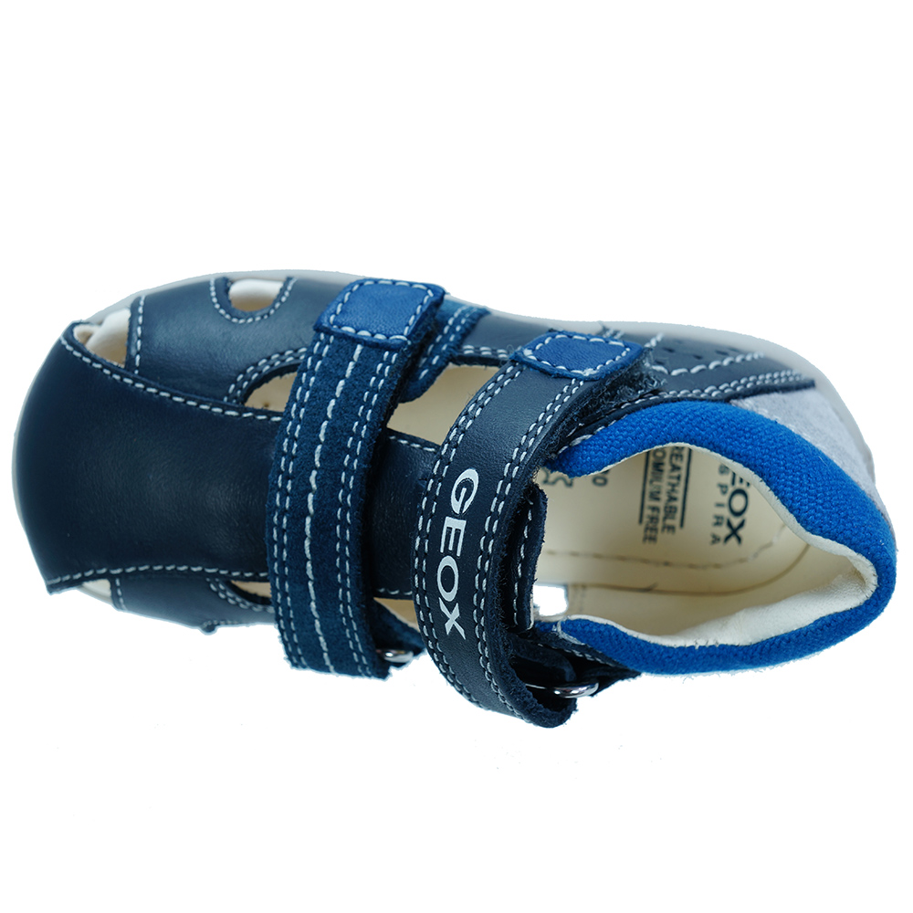 Βρεφικό ανατομικό πέδιλο με velcro (χριτς-χρατς) και κίτρινες λεπτομέρειες του ιταλικού οίκου Geox. Κατασκευασμένο από δέρμα και συνθετικό εξωτερικά και δέρμα εσωτερικά. Διαθέτει δερμάτινο πάτο και ελαστική αντιολισθητική σόλα.