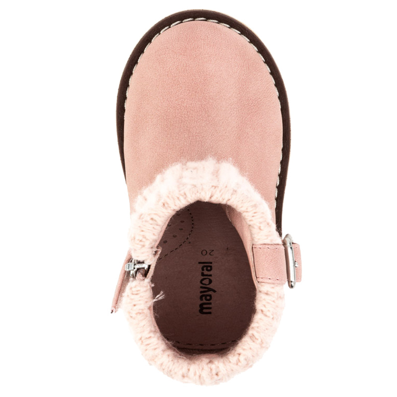 Βρεφικό μποτάκι με γούνινες λεπτομέρειες του ισπανικού οίκου Mayoral. Κατασκευασμένο από συνθετικό εξωτερικά και με υφασμάτινη επένδυση εσωτερικά. Διαθέτει δερμάτινο πάτο και ελαστική αντιολισθητική σόλα.