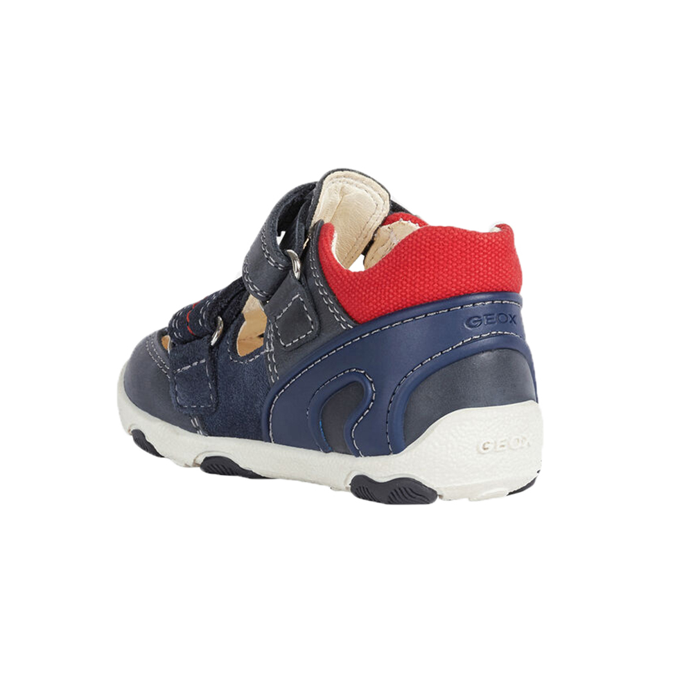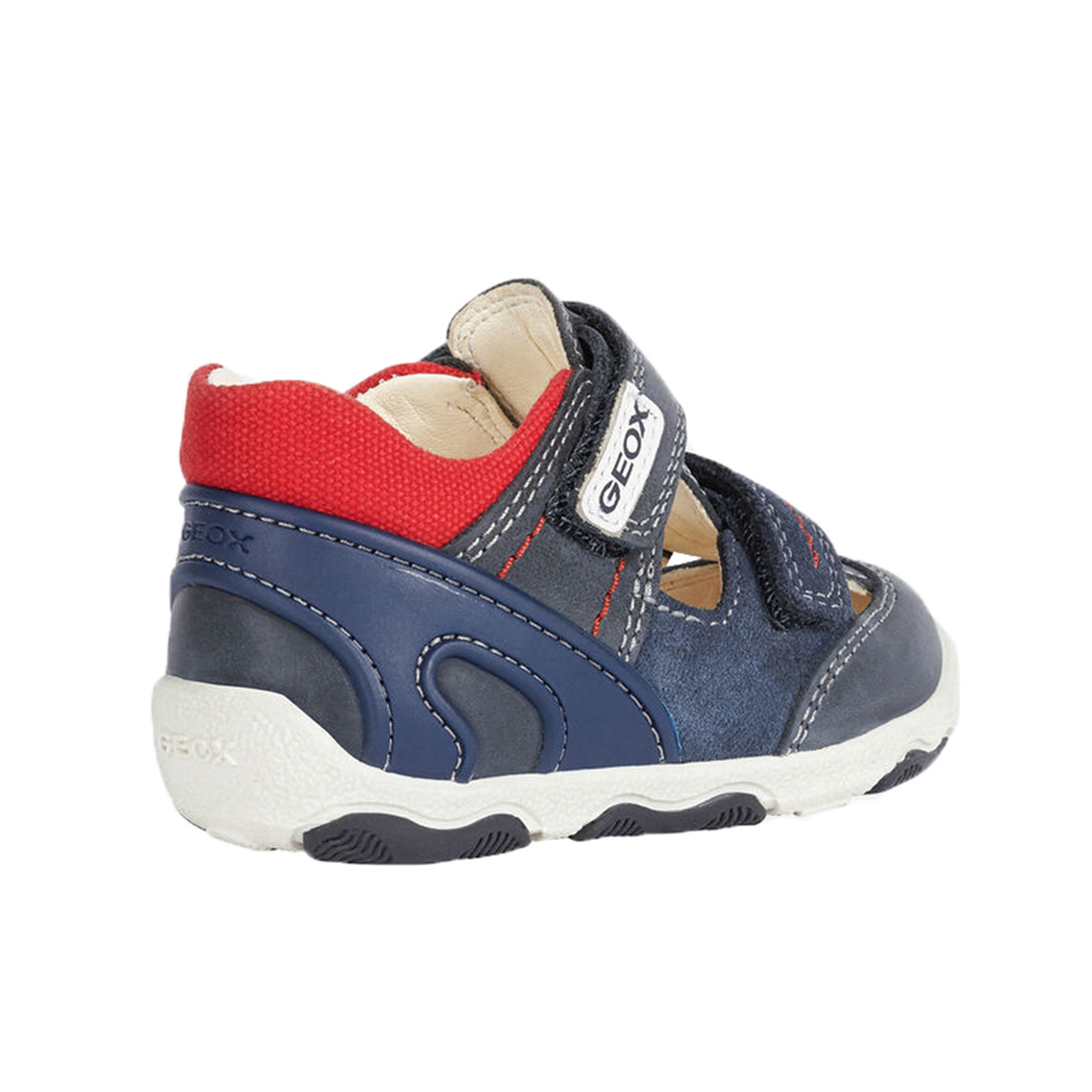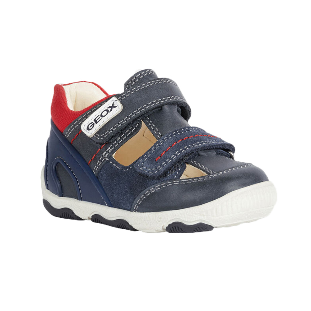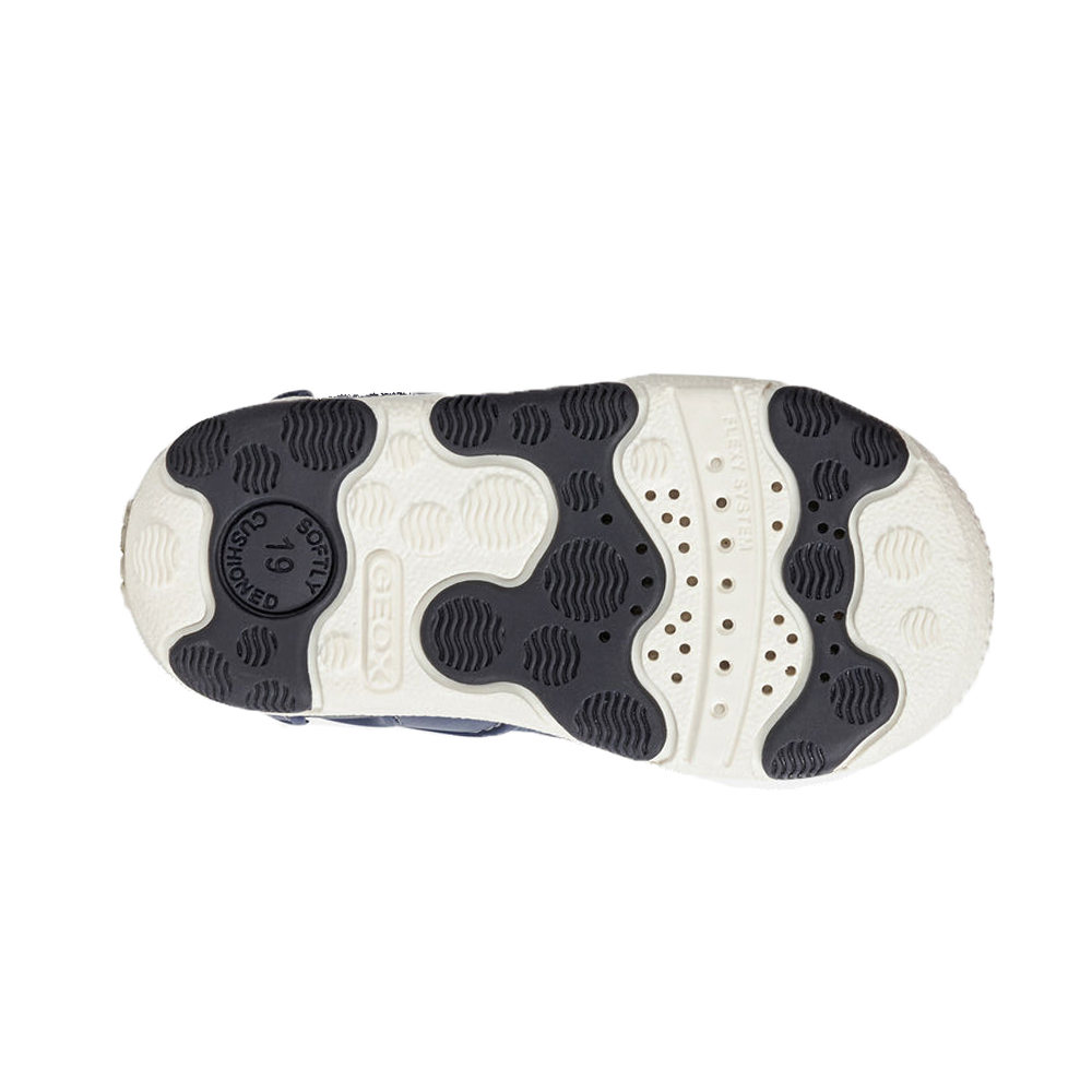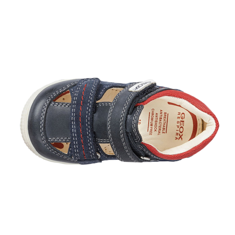 Βρεφικό ανατομικό πέδιλο με velcro (χριτς-χρατς) και κίτρινες λεπτομέρειες του ιταλικού οίκου Geox. Κατασκευασμένο από δέρμα και συνθετικό εξωτερικά και δέρμα εσωτερικά. Διαθέτει δερμάτινο πάτο και ελαστική αντιολισθητική σόλα.