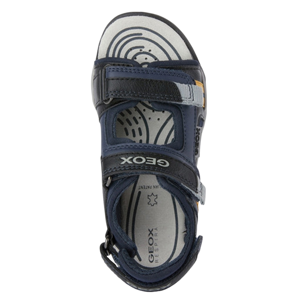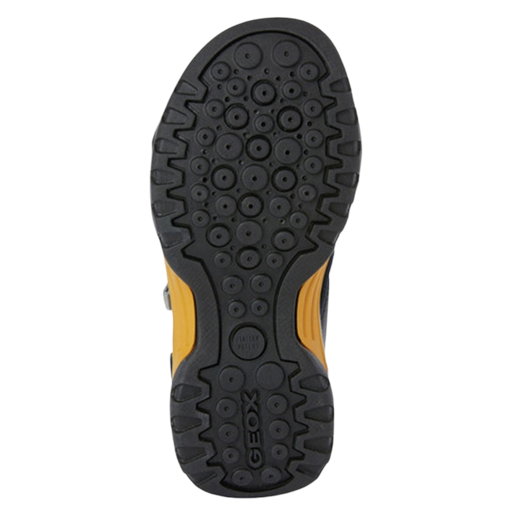 Βρεφικό ανατομικό πέδιλο με velcro (χριτς-χρατς) και κίτρινες λεπτομέρειες του ιταλικού οίκου Geox. Κατασκευασμένο από δέρμα και συνθετικό εξωτερικά και δέρμα εσωτερικά. Διαθέτει δερμάτινο πάτο και ελαστική αντιολισθητική σόλα.