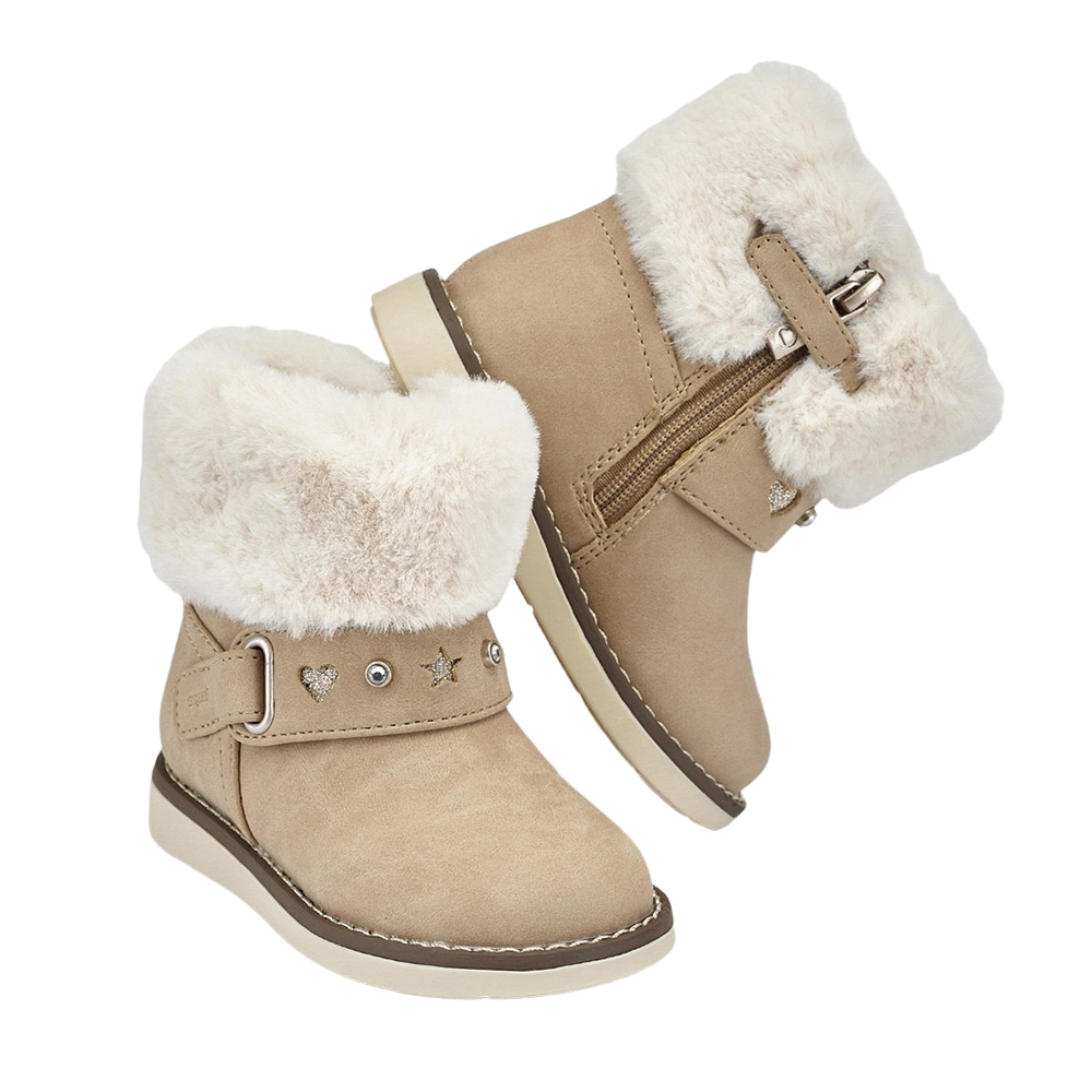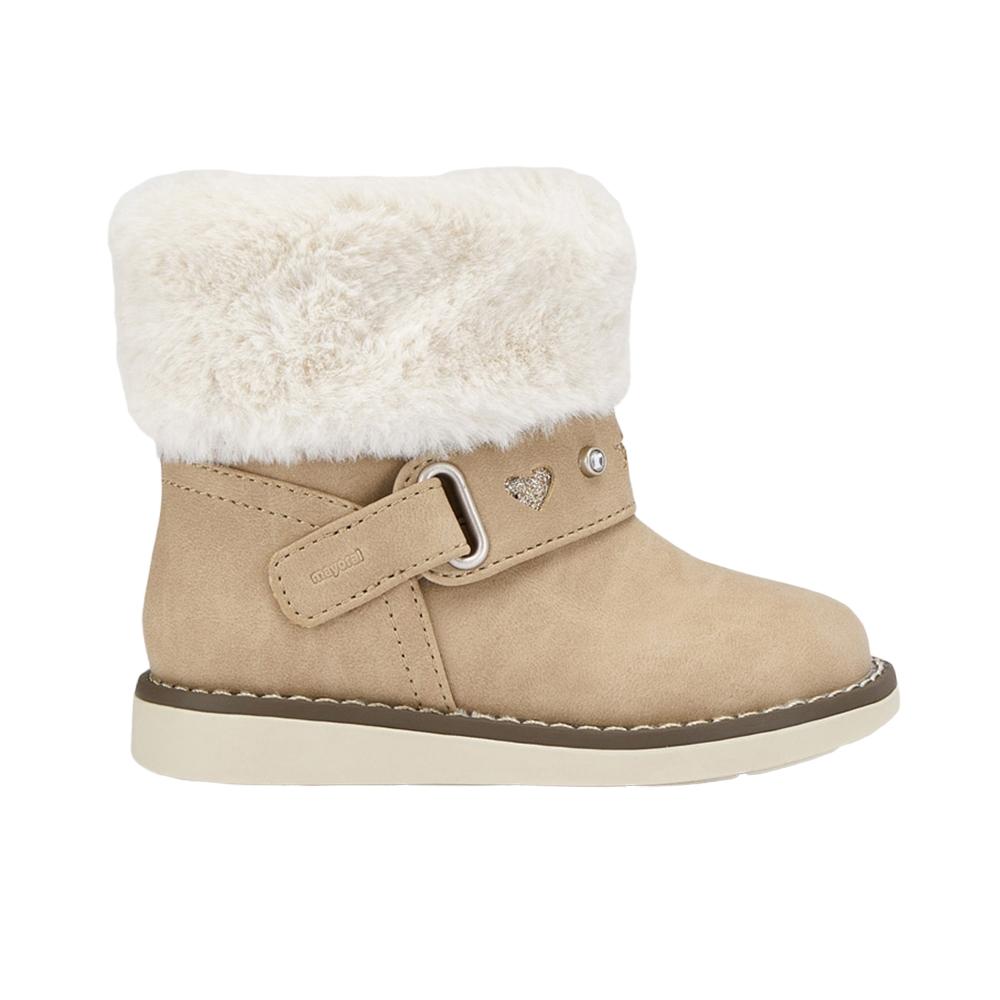 Βρεφικό μποτάκι με γούνινες λεπτομέρειες του ισπανικού οίκου Mayoral. Κατασκευασμένο από συνθετικό εξωτερικά και με υφασμάτινη επένδυση εσωτερικά. Διαθέτει δερμάτινο πάτο και ελαστική αντιολισθητική σόλα.