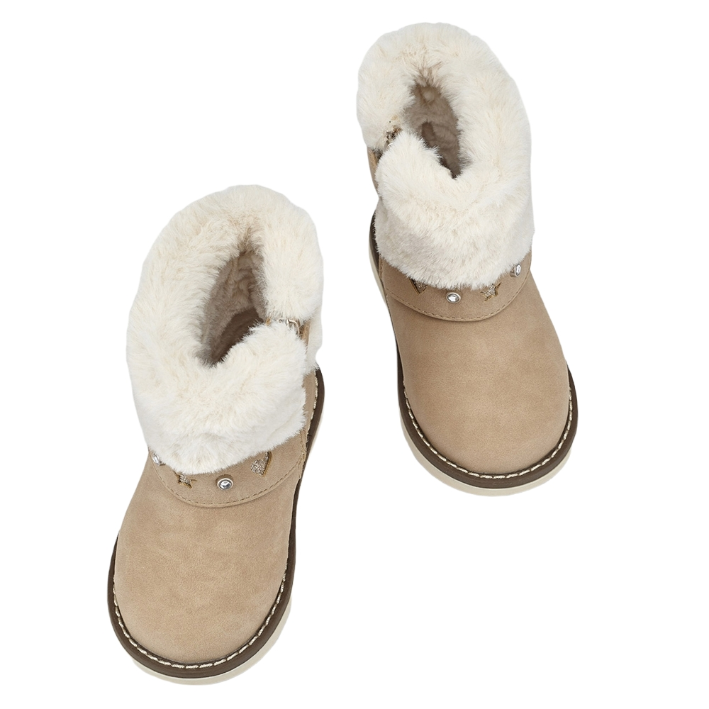 Παιδικό μποτάκι με γούνινες λεπτομέρειες. Κατασκευασμένο από συνθετικό δέρμα εξωτερικά και με υφασμάτινη επένδυση εσωτερικά. Διαθέτει ελαστική αντιολισθητική σόλα και δερμάτινο ανατομικό πάτο.