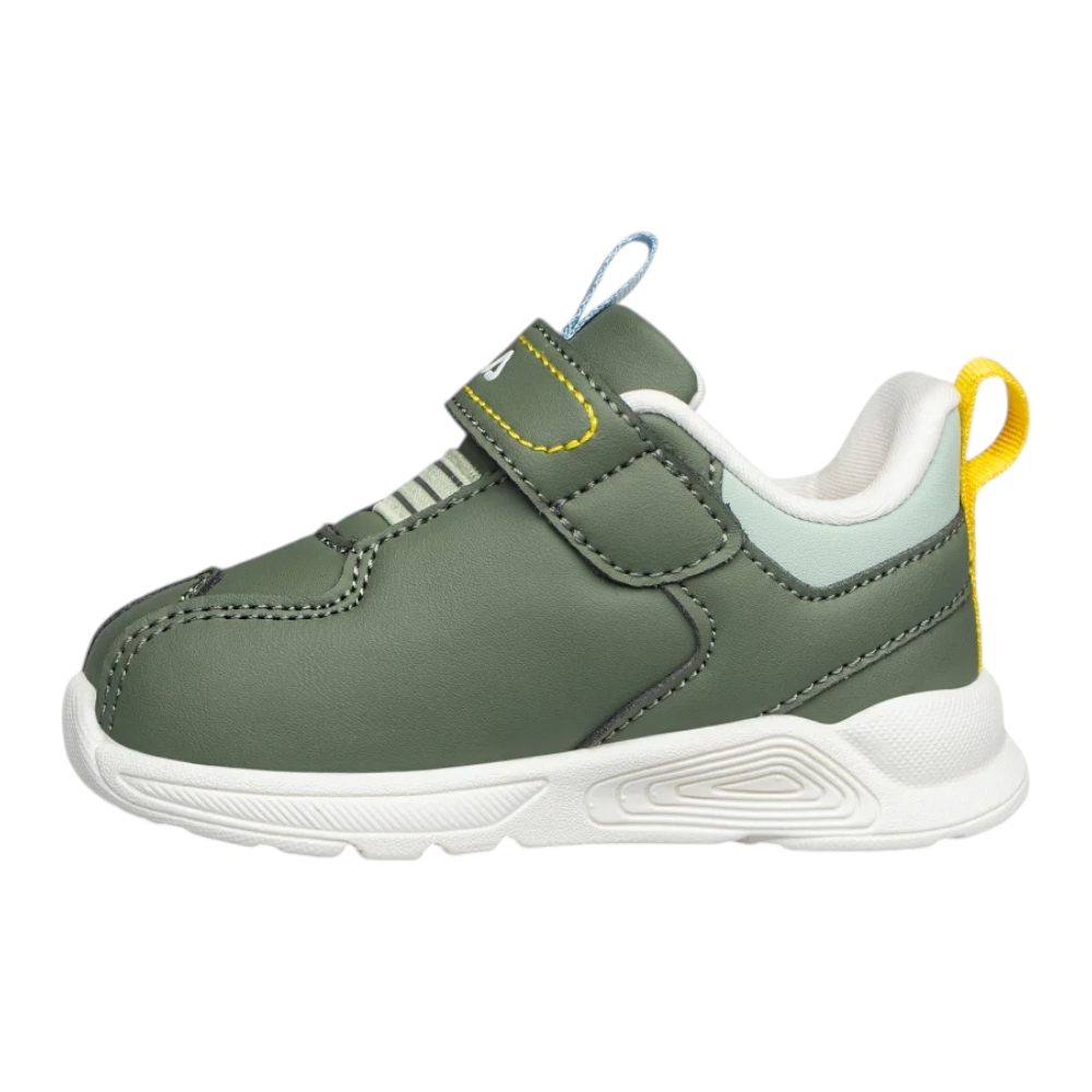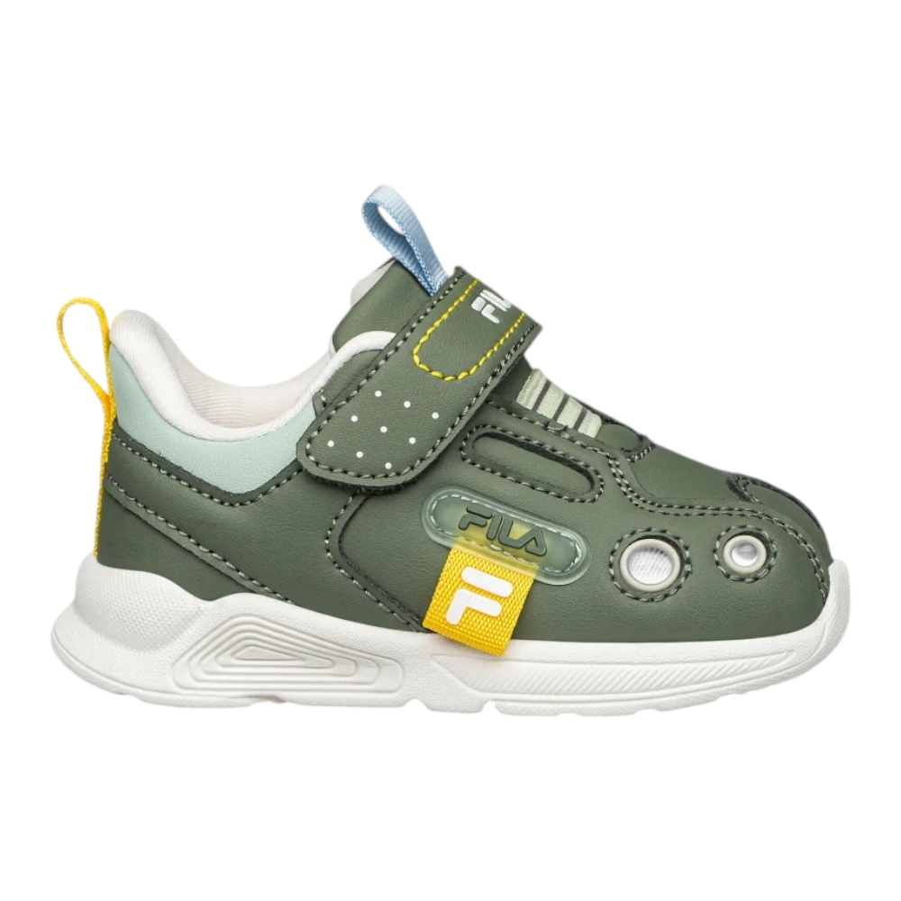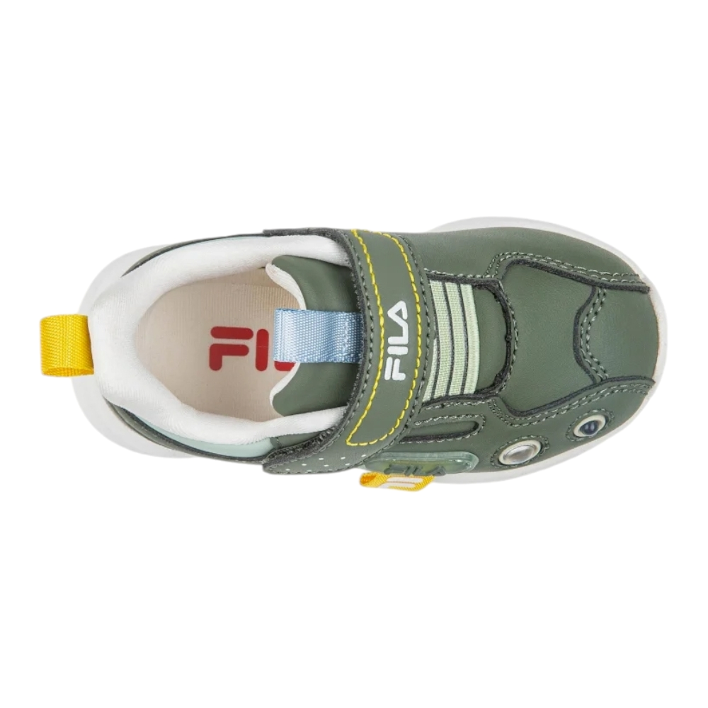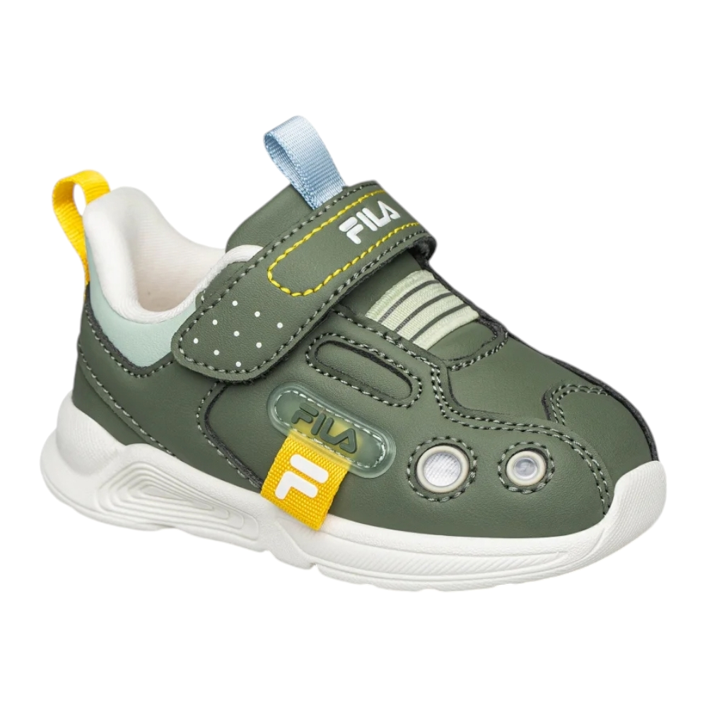 Παιδικό sneaker με λαχανί λεπτομέρειες, του οίκου Fila. Κατασκευασμένο από συνθετικό δέρμα και καμβά εξωτερικά και με υφασμάτινη επένδυση εσωτερικά. Διαθέτει ελαστική αντιολισθητική σόλα.