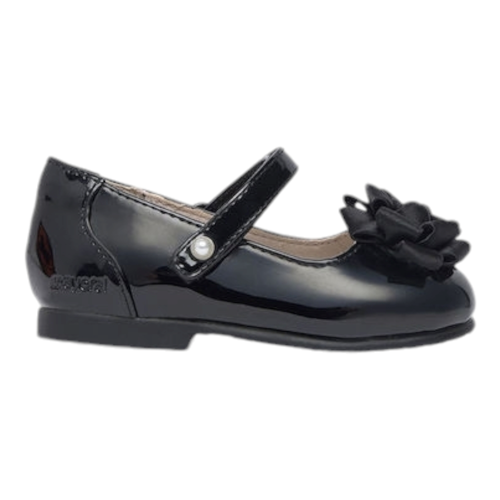 Παιδική μπαλαρίνα με περλίτσες του ισπανικού οίκου Mayoral. Κατασκευασμένη από συνθετικό δέρμα εξωτερικά και δέρμα εσωτερικά. Διαθέτει δερμάτινο πάτο και ελαστική αντιολισθητική σόλα.