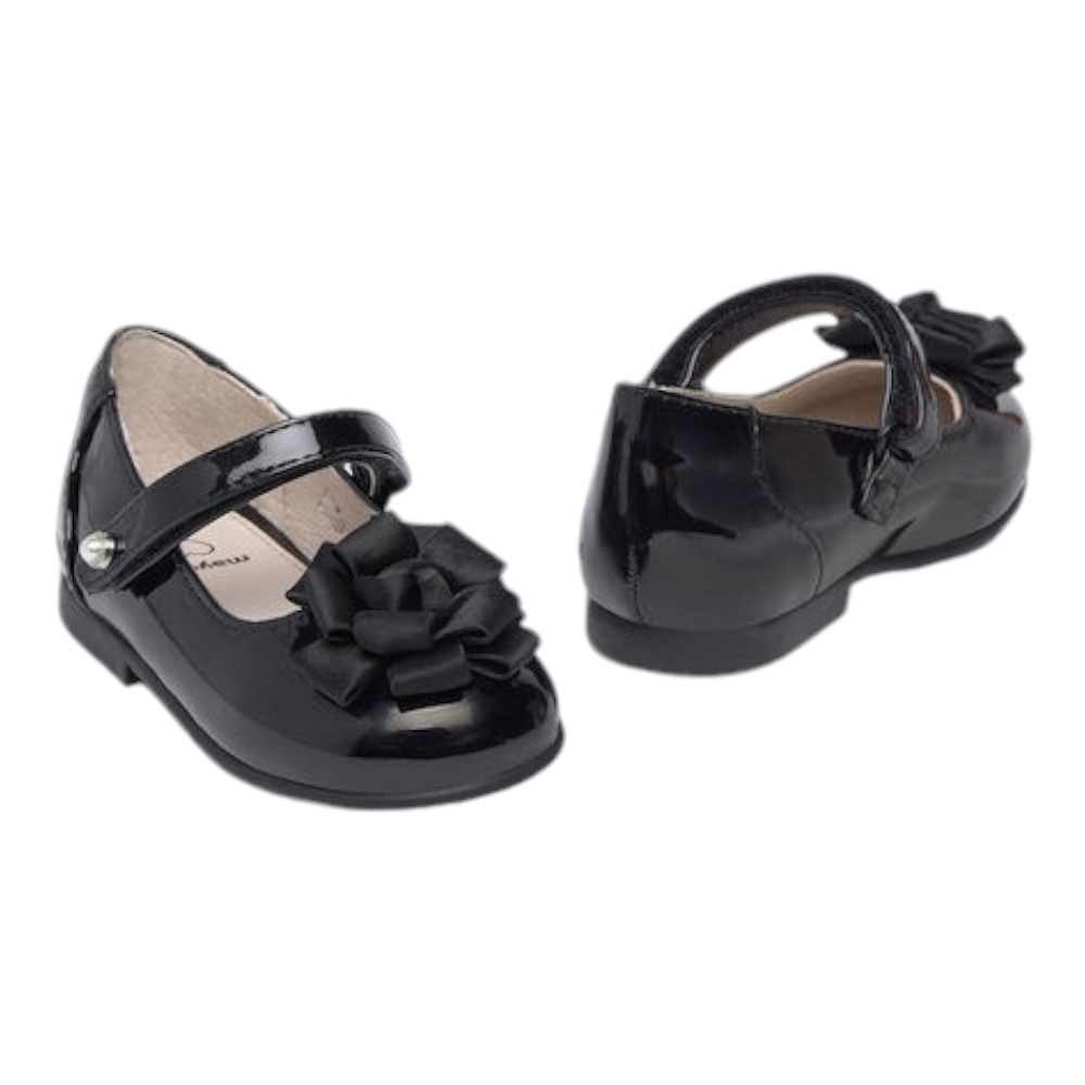 Βρεφική μπαρέτα λουστρίνι, του ισπανικού οίκου Mayoral. Κατασκευασμένη από συνθετικό εξωτερικά και δέρμα εσωτερικά. Διαθέτει δερμάτινο πάτο και ελαστική αντιολισθητική σόλα.