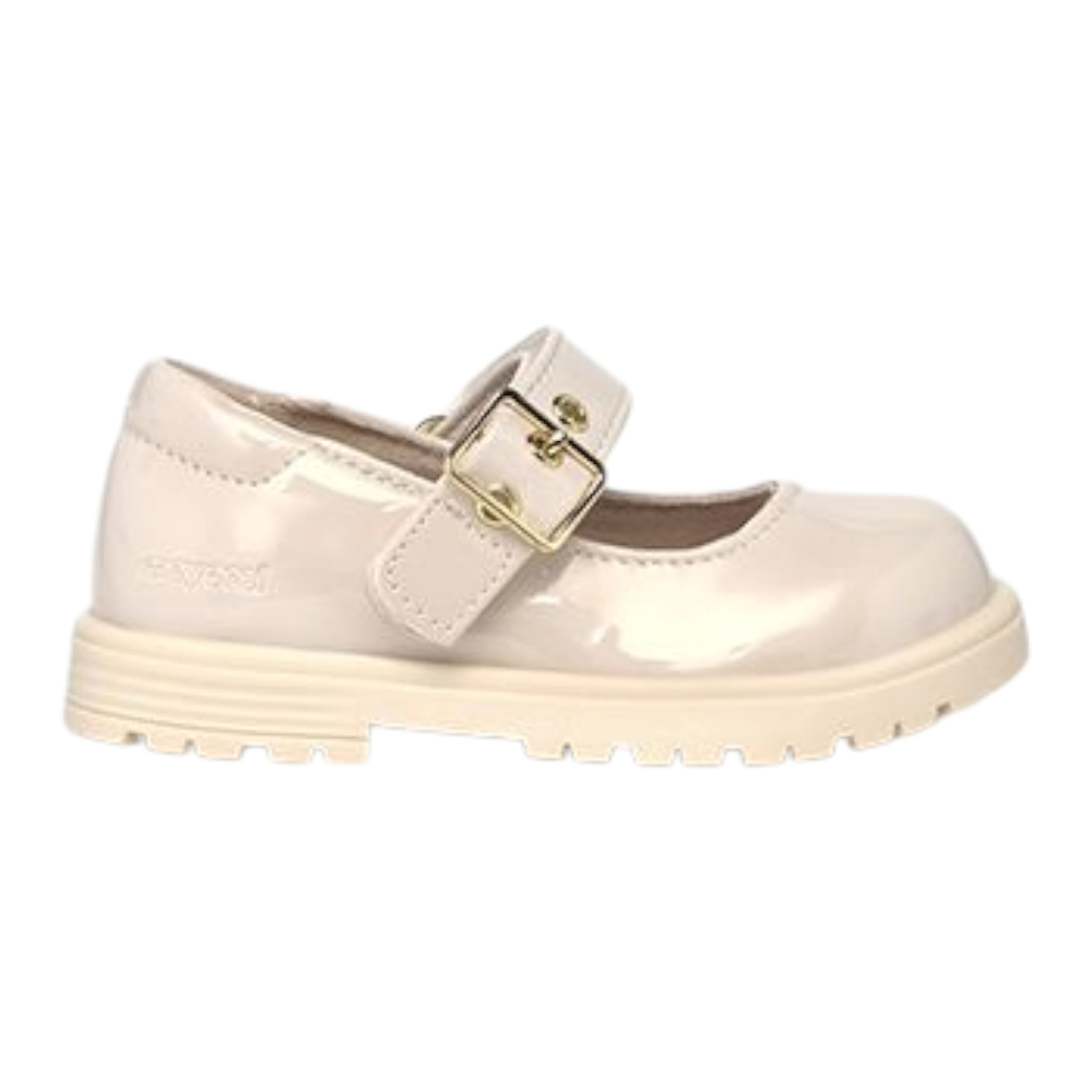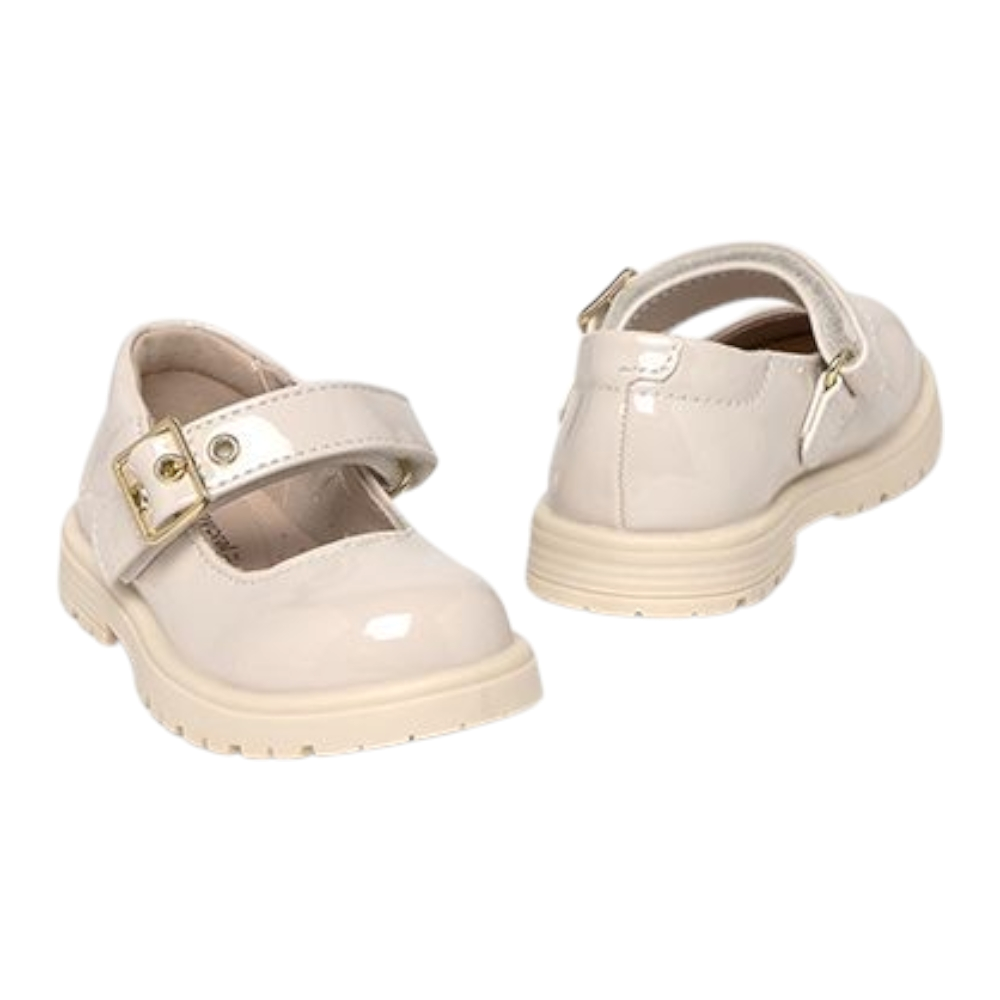 Βρεφική μπαρέτα λουστρίνι, του ισπανικού οίκου Mayoral. Κατασκευασμένη από συνθετικό εξωτερικά και δέρμα εσωτερικά. Διαθέτει δερμάτινο πάτο και ελαστική αντιολισθητική σόλα.