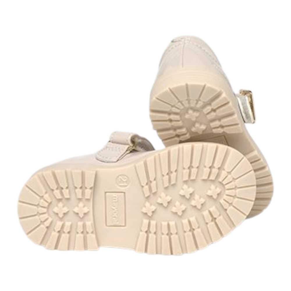 Παιδική μπαλαρίνα με περλίτσες του ισπανικού οίκου Mayoral. Κατασκευασμένη από συνθετικό δέρμα εξωτερικά και δέρμα εσωτερικά. Διαθέτει δερμάτινο πάτο και ελαστική αντιολισθητική σόλα.