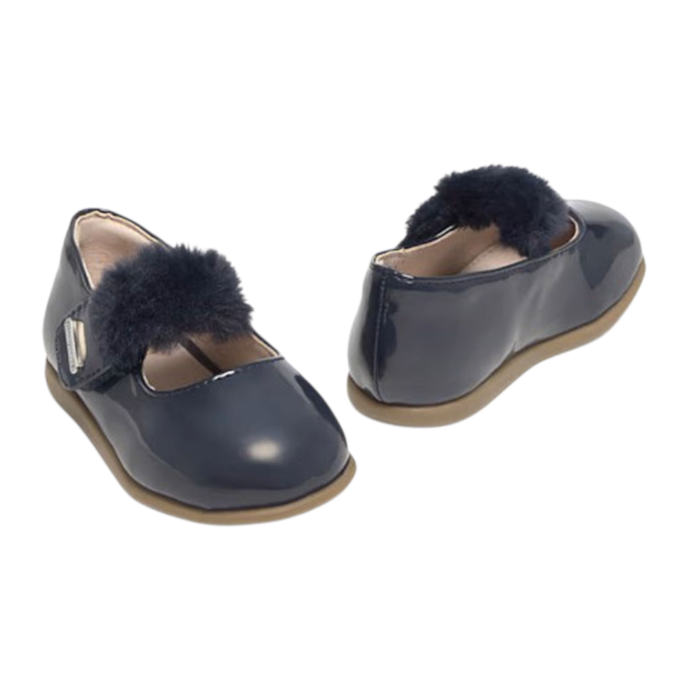 Βρεφική μπαρέτα λουστρίνι, του ισπανικού οίκου Mayoral. Κατασκευασμένη από συνθετικό εξωτερικά και δέρμα εσωτερικά. Διαθέτει δερμάτινο πάτο και ελαστική αντιολισθητική σόλα.